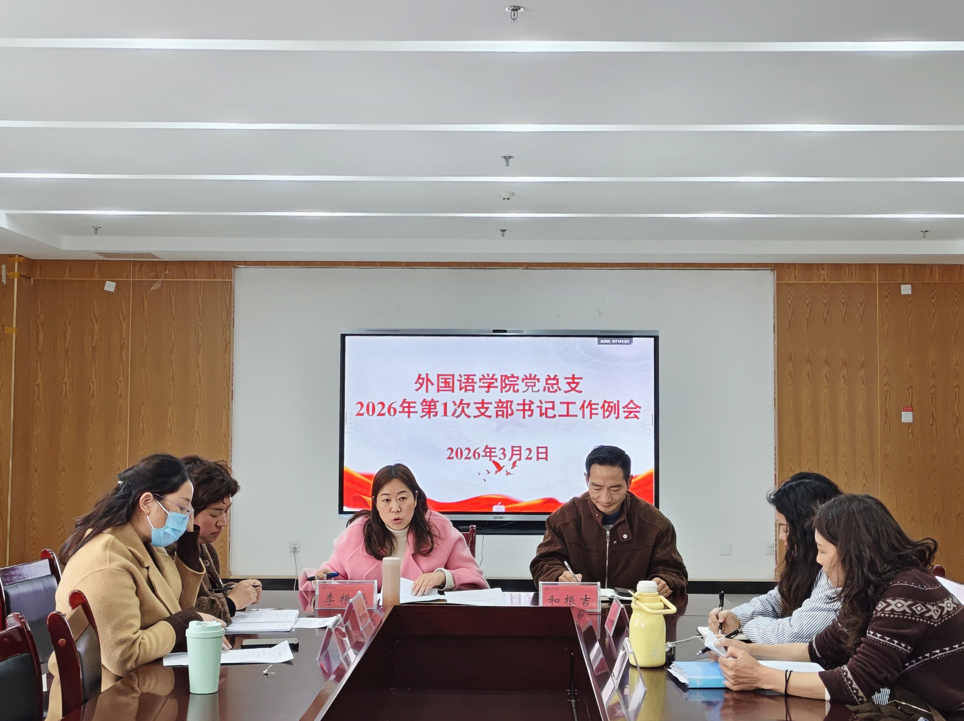 3月2日,外国语学院党总支在励志楼401召开2026年第1次支部书记例会。会议由学院党总支书记李根艳主持,党总支副书记、专职组织员、教师党支部书记及学生党支部书记参加。会议围绕理论学习与党建工作部署展开,旨在为全年基层党建工作明确方向、细化举措,确保“十五五”开局之年各项任务稳步推进。
