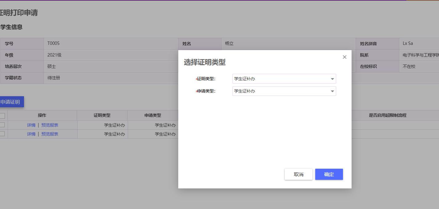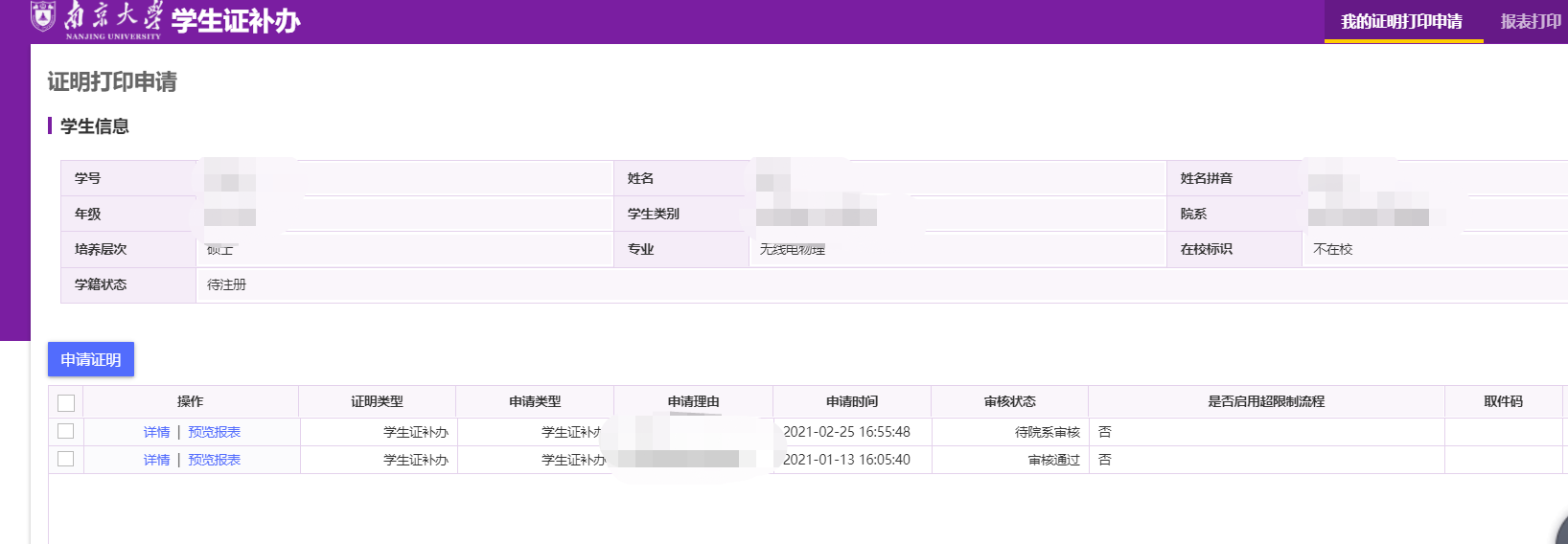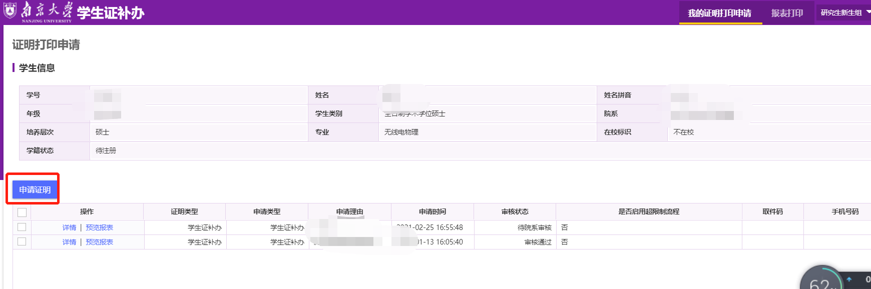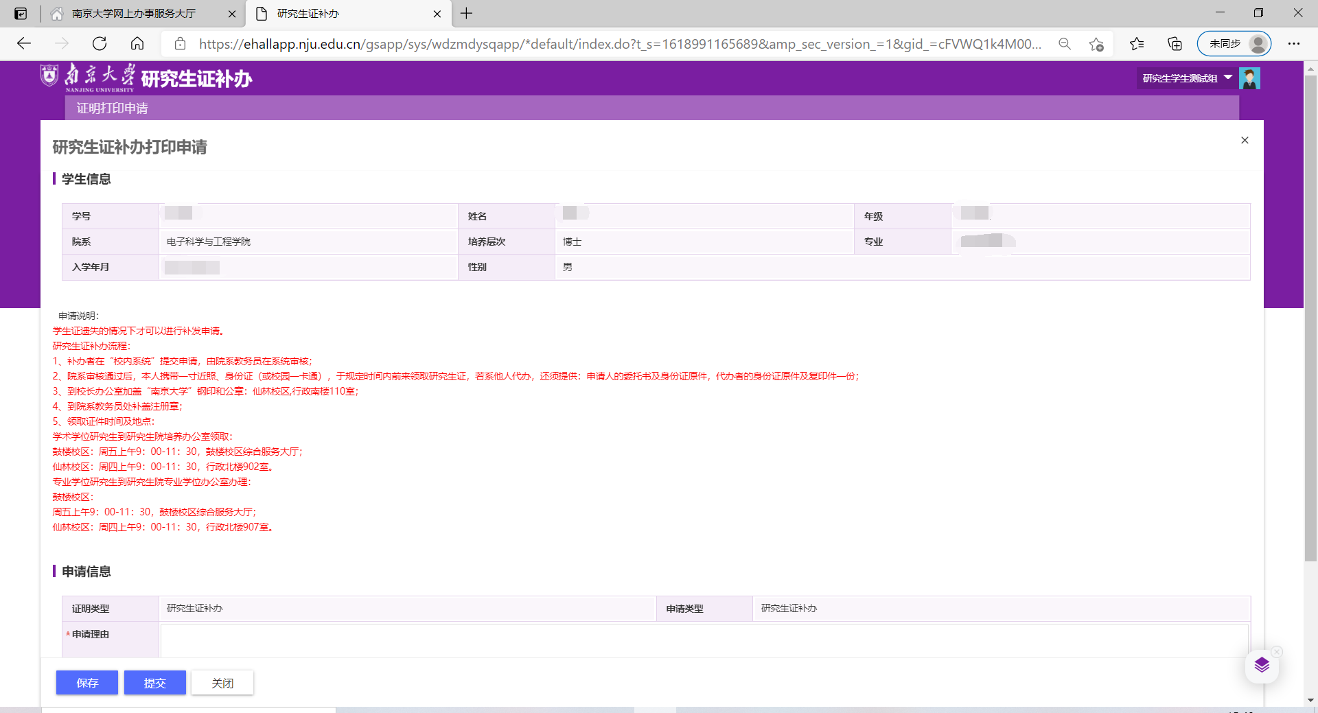 3.填写申请表单:申请理由、研究生证遗失地址、研究生证遗失时间,点击【提交】按钮,进行提交。