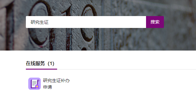 点击选中”研究生服务”,在下方应用功能中找到” 研究生证补办申请”,点击进入研究生证补办申请应用。