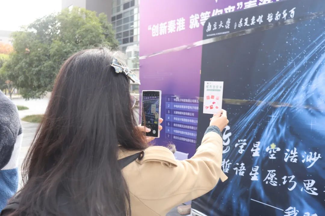 临近中午,“世界哲学日”展台逐渐热闹起来,在“这是什么活动”“什么是世界哲学日”的提问与解答中,哲思飞船正式起航。领取集章卡、挑战展台活动、领略哲人风采、收获哲学知识、打卡精美印章、领取南哲文创六大环节环环相扣。