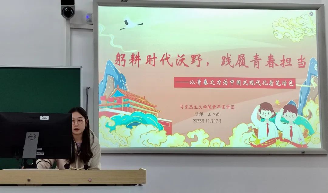 王心雨讲师从实践角度,向新时代的青年发出了“躬耕时代沃野 践履青春担当”的号召。她介绍了中国式现代化的内涵和特征,并带领同学们回望历史浪潮,强调以“青春之力”为中国式现代化着笔增色的理想追求。她精彩有力的宣讲使同学们坚定了属于我们的青年担当和必胜信念。