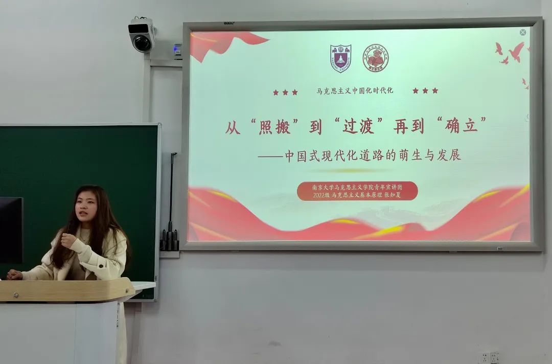 张知夏讲师从历史叙事的角度讲述了中国式现代化道路的萌生和发展。她表示,中国现代化的道路探索分为“照搬”“过渡”“确立”三个阶段,也是从效法欧美被动开启中国现代化到如今实现中国式现代化的创新发展的艰辛过程。她娓娓道来的叙述让同学们领略了党的光辉历程、伟大成就和实践经验,使同学们通过理解中国式现代化萌生发展的历史进程,以更加自觉的历史主动精神迈向建设社会主义现代化强国的新征程。